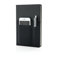 A5 omslag met magnetische sluiting en pennenlus. Binnen in 3 vakjes voor business cards en 1 groot vak. A5 notitieboek met 128 pagina’s van 80 g/m2.
