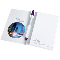 Conference set in A4-formaat. Bevat een A4 kladblok met 50 bladen (80g/m2) blanco papier en een ballpointpen in de rug. De conference set heeft een harde omslag (350g/m2). Volledig gekleurde decoratie mogelijk aan beide zijden van de omslag en op elk blad
