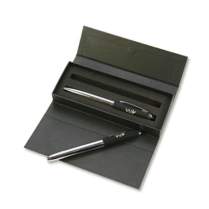 Deze pennenset heeft een klassiek ontwerp met een moderne combinatie van functionaliteit. Aerodynamische belijning in een elegant metaal en zachte softlaag maken de Nautic een deftige reclamedrager voor de VU Pennenset van pen en rollerbalpen in zwarte giftbox. Houder en beslagdelen: Metaal, glanzend vechroomd; bovenstuk en gripzone: softlaag