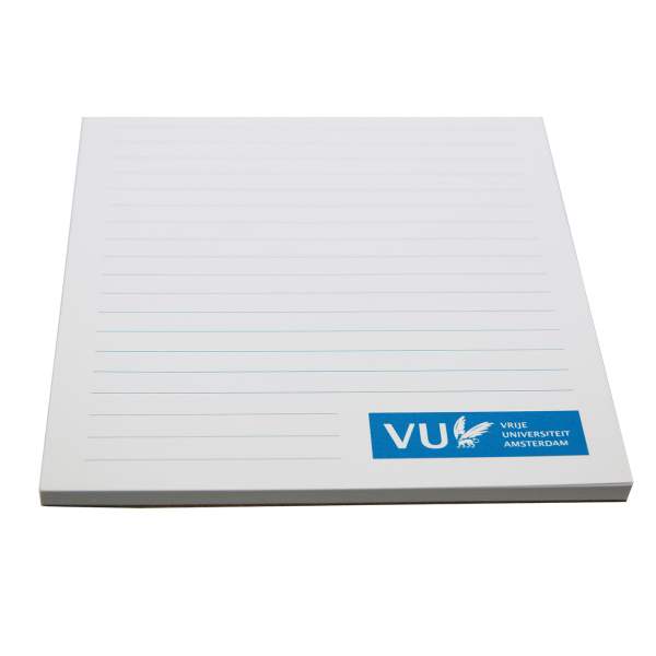 Schrijf je notitieblok vol met aantekeningen, boodschappenlijstjes, bucketlists, of je dagboek. Met dit gelinieerde A5 notitieblok vol onbeschreven pagina’s kunt u direct aan de slag. Bedrukt met het Nederlandse VU logo. Prijs per set van 60 stuks. Direct leverbaar.