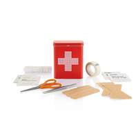 24-delig, inclusief verband, medische handschoenen, schaar en medisch tape in nylon etui, de inhoud is vlak gepakt zodat de volledige set door de brievenbus past, 200gr, conform EN 13485:2003.