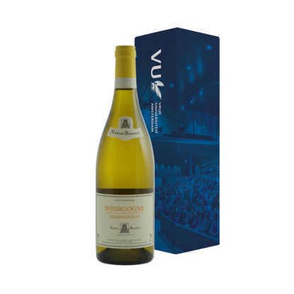 Luxueuze wijndoos met een heerlijke wijn uit Frankrijk: Nuiton-Beaunoy Bourgogne Chardonnay (0.75L). De doos is speciaal gemaakt in VU stijl.