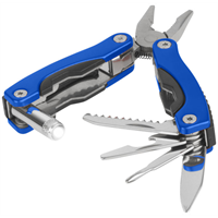 Met Philips kruiskop en platte schroevendraaier, flesopener, kurkentrekker, blikopener, briefopener, pincet, tandenstoker en mes. Inclusief mini sleutelring. ABS Plastic.
