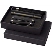 Met mes, schaar, kurkentrekker, flesopener, Philips schroevendraaier, nagelvijl, kast lifter met kratopener en platte schroevendraaier. Inclusief mini-metalen split sleutelring. Aluminium.